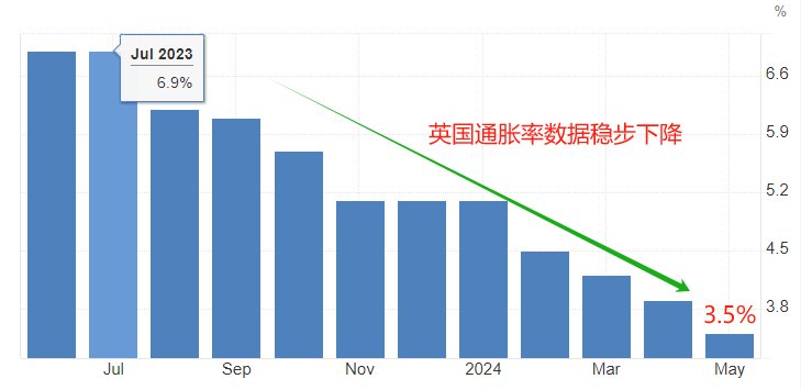 史籍数据看,英邦的中枢CPI年率处于疾速降低趋向。2023年6月份通胀率仍处于6.9%高位,本年5月份就仍旧消重至3.5%,11个月功夫的累计降幅3.4%,均匀每月降低0.31个百分点。主流主睹将通胀率的疾速降低归功于英央行的紧缩泉币策略。2021年12月至2023年8月,短短一年众功夫里,英央行加息14次,将基准利率从0.1%推高至5.25%。跟着基准利率的升高,排场消费和企业扩产受到明显胁造,商品总需求连续减弱,最终导致物价降低。除了紧缩泉币策略除外,能源价钱的明显回落是也是导致英邦CPI数据稳步降低的厉重来由。迩来两年,美原油的累计跌幅跨越30%,时值从100美元/桶上方回落至此刻的80美元下方,这缓解了欧美等能源消费大邦的很大一局部通胀压力。ATFX汇市:据英邦统计局数据,英邦5月中枢CPI年率为3.5%,低于前值3.9%;英邦5月表面CPI年率为2%,低于前值2.3%。中枢CPI年率和表面CPI年率比拟前值辨别降低0.4个百分点和0.3百分点,意味着英邦的通胀率仍处于疾速降低状况。按此速度策画,中枢CPI年率将会正在3~4个月后到达2%的历久调控目的。主旨银行往往会提前举动,不会正在通胀率到达既定目的后才早先降息。据此剖断,5月份的CPI数据告示后,商场人士闭于英央行降息的预期将大增。