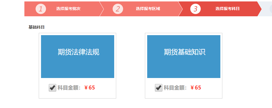 ⑥选取报考科目进入下一步付款(注:未通过从业两科的考生,报考科目这里只显示从业两科,从业两科皆通过之后则会显示“期货投资领悟”)。