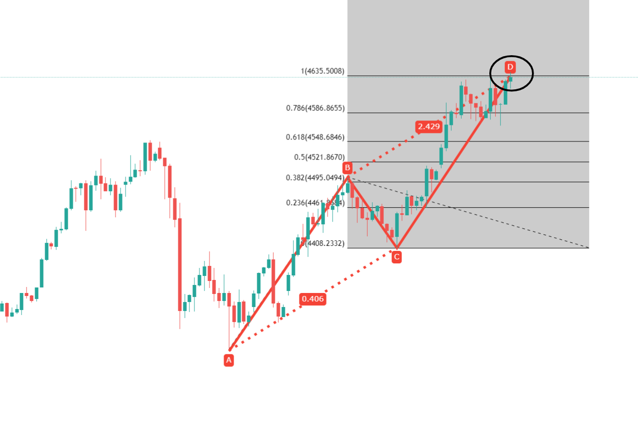正在我的业务体验中,这行情是不行提前看跌的,早上直播许众人问要不要提进展,看似能够把防守放正在前高30,但原本这跟墟市送钱没什么区别,思要做这种高位调治惯性业务,那价钱就必要要高,何如才算高?那笃信要跟前高对标才行,更别说这里如故一个量度高位压力了,我图里的两阶段上涨,网罗ABCD的止境也都正在4635,那欠好兴味,这里即是我这日的看跌位,现正在仍然进场,不算健壮,跌了几美金罢了,防守就直接锁正在高点4650,我的方向很纯洁,不央浼什么大跌特跌,只须要到位4600就跑途,这三十几美金仍然够我用了。