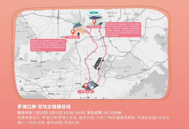 停靠站点:甘坑古镇→宝亨达旅馆→龙岗万达广场→深圳大运中央→龙岗万达广场→宝亨达旅馆→甘坑古镇