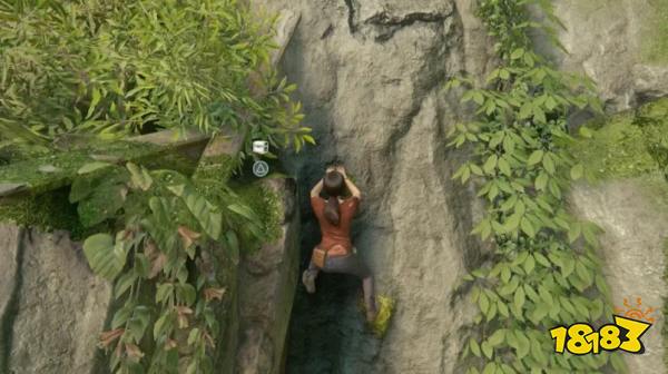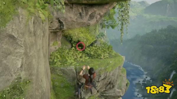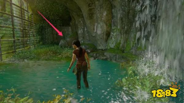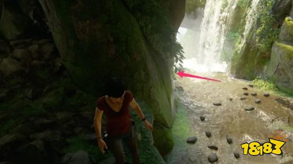 拿到上一个宝藏后浮出水面,从瀑布右后方的小径走,然后从土坡滑下去,留意不要滑终究,跳起来收拢左侧岩石,向上爬到顶,宝藏就正在火线边沿处。