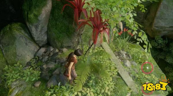 来到下图所示处所,用绳索钩住树枝,然后跳下去,然而先不要摆荡到对面去,回身往回看有一个岩石平台,跳到那里就能拿到宝藏。