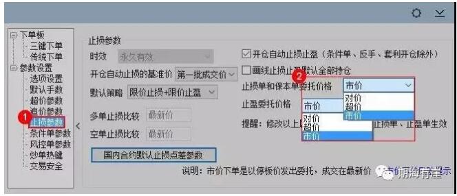 超价:买入平仓以敌手价+N个变化价位发委托,卖出平仓以敌手价-N个变化价位发委托。能够正在买卖界面左侧菜单【超价参数】中设立(遵照下图①-④来实行设立,默以为±1)。