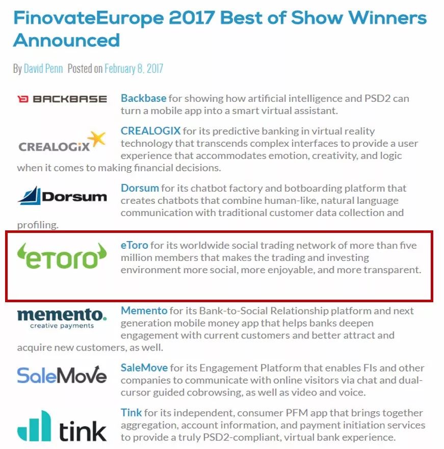 依靠良好的任事和进步的本事,e投睿eToro于2012、2015与2017年正在金融科技行业最巨擘学术聚会Finovate 上三度斩获最大声望“最佳呈现大奖”。 2015年,e投睿eToro位列英邦伦敦金融城年度Fintech100 环球第34名;2016年,正在陆家嘴China Financial Herald金融科技20强榜单中排名第7。