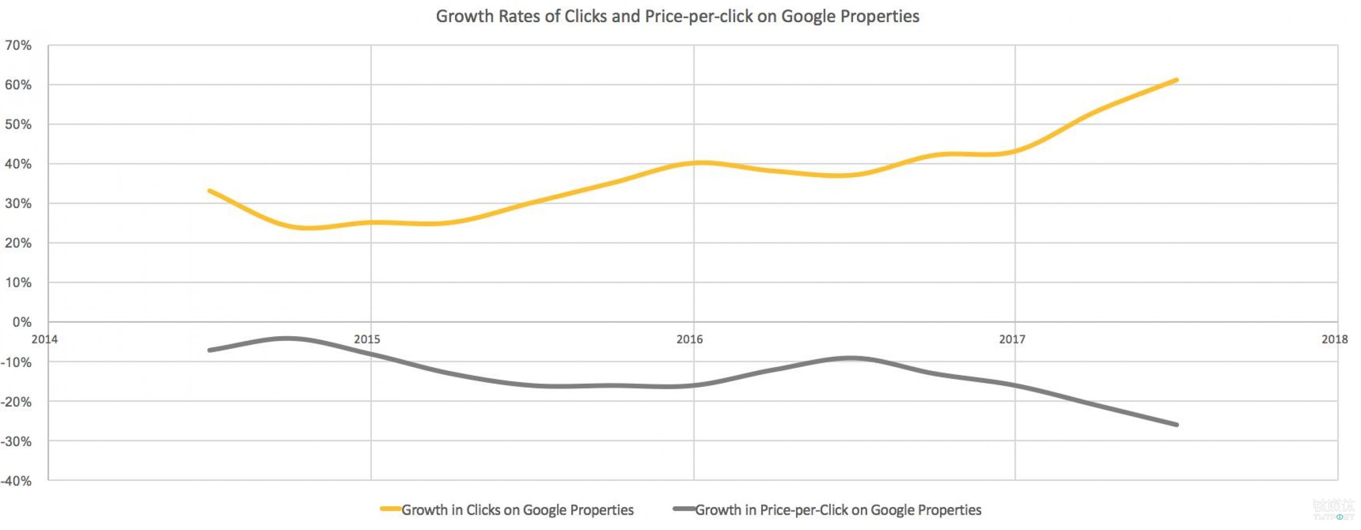 从上图能够看到,Google的CPC一齐下跌,最终的结果是,正在Google上广告主付出了更少的价钱,而用户看到了更众的广告。(Google靠如许的形式强撑收入,华尔街并不是那么买账。)