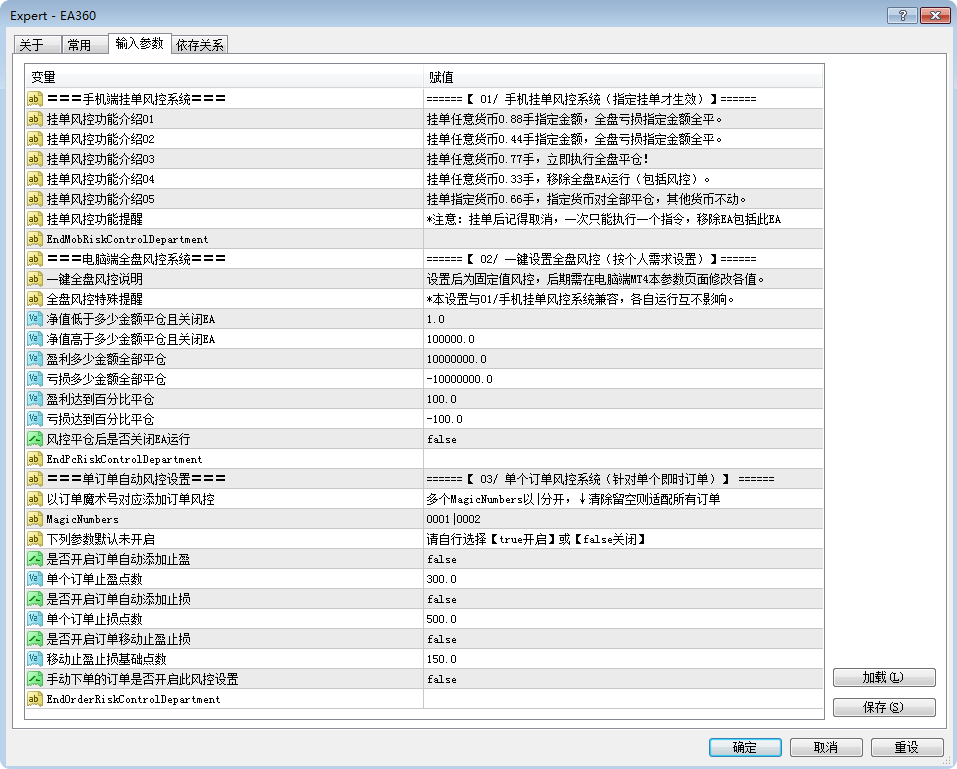 EA360要紧使用于MT4外汇生意软件上的账户危机把持主动化辅助体系,要紧可能通过软件的参数成立值,举办账户的止盈止损、净值比例、搬动止盈止损、闭塞移除EA等风控性能。