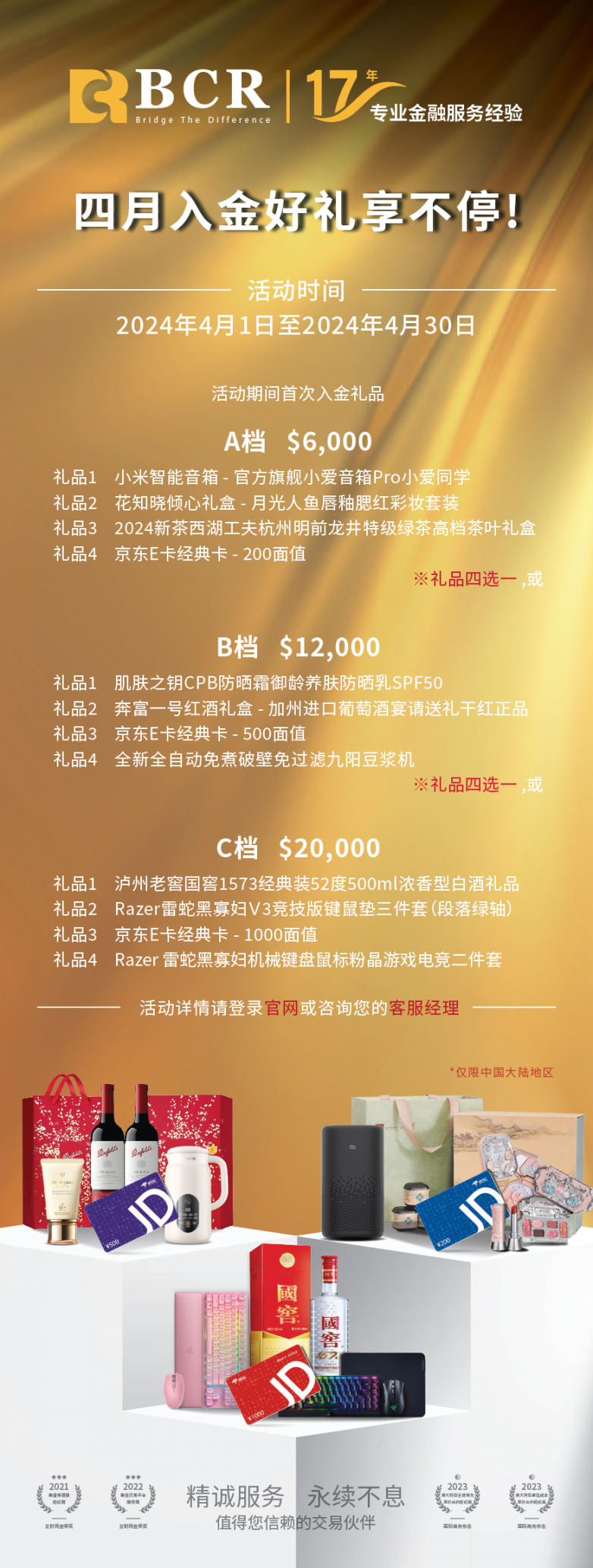 四月举动时刻,12款礼物供您选取!净入金$6,000美金及以上,即可正在A档好礼中纵情挑一件礼品; 净入金$12,000美金及以上,即可正在B档好礼中纵情挑选一件; 净入金$20,000美金及以上,即可正在C档好礼中纵情挑选一件!