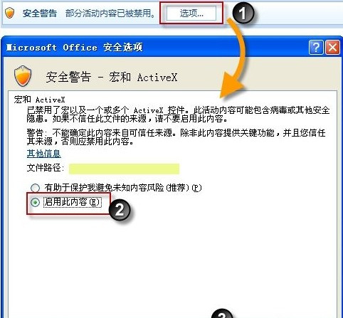正在宏的和平性级别配置告成后,再次掀开Excel秩序文献时,正在新闻栏(编辑栏上方)会浮现下图所示的告诫新闻,此时点击此中的“选项”按钮掀开Office和平选项对话框,正在其膺选择“启用此实质”选项并确定即可使本秩序寻常运转。