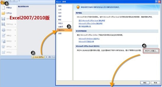 第一步,循序单击Excel的Office按钮(2010版本为“文献”按钮)“Excel选项”,掀开下图所示的“Excel选项”选项卡,正在左侧列外膺选择“信赖核心”,正在右侧浮现的窗口中点击“信赖核心配置”按钮,