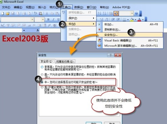 第一步,正在Excel的菜单栏上循序单击“东西”“宏”“和平性”,掀开下图所示的“和平性”对话框,