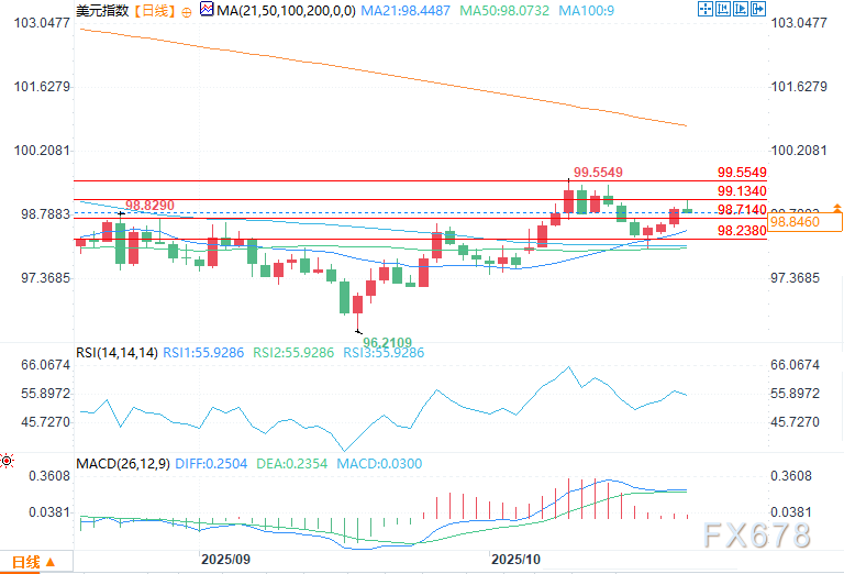 价格走势可能继续受限2025年10月24日日内美元指数来往区间为99.139至98.836。此前指数曾短暂探索98.797-98.8714撑持区间的上沿,随后回落。该区间至闭紧急:若跌破98.714这一斐波那契程度,指数或许进一步下探98.238的50%回撤位,以及98.078的50日均线——后者正在上周曾阻挡住指数的下跌势头。指数上行空间仍看向99.5549,但若无短期看涨催化剂,代价走势或许一连受限。