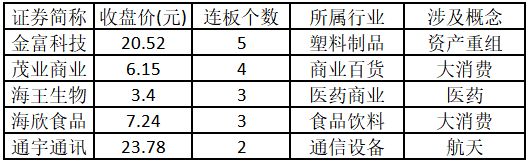 从连板境况来看,今日首板个股有61只;2连板的个股有5只;3连板及以上的个股有4只。今日连板数排名前5的个股网罗金富科技、茂业贸易、海王生物、海欣食物、通宇通信,详细如下外所示。