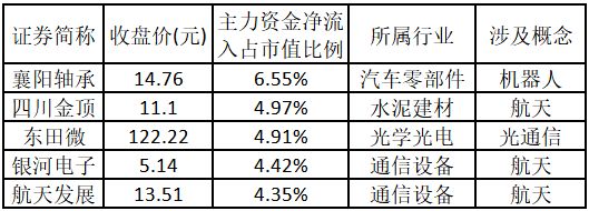 主力资金净流入金额占市值比例排名前5的个股分离为襄阳轴承、四川金顶、东田微、银河电子、航天兴盛。