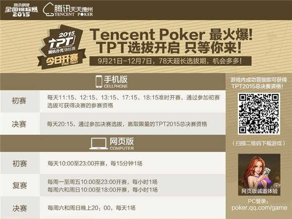 自9月21日起至12月7日止,长达78天的线上选拔期,《Tencent Poker》搬动版和网页版将同步开启,为每一位参赛选手供应充裕的期间安乐台涌现扑克运动的竞技精神和竞手艺力。TPT2015诚挚邀请环球竞技扑克运动的喜好者一道插手,协同打制一场竞技扑克年度嘉会!