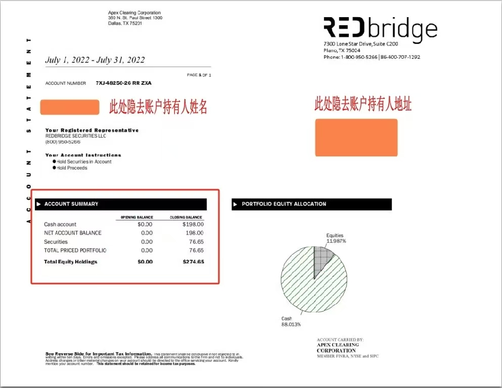 始料未及,记者收到一封怪异的生疏邮件,发件人工“****”,邮件正文实质为空缺,附件为“说明2.png”。掀开附件,实质为美股证券经纪商“REDbridge”的英文版账单。奇特的是,账户持有人名称及地方均为记者自己正在老虎证券开户申请时提交的身份新闻的拼音,刻日为“2022年7月1日至2022年7月31日”,账户号码为“7**-*****-*****XA”。该账户的资产新闻显示:“期末现金余额198美元,有价证券76.65美元,总资产274.65美元。”但上述美股账单除身份新闻外的任何其他新闻均与记者自己无合。记者从未有过美股账户,但正在此时方今、此情此景下,这份“飞来”的美股账单的居心昭然若揭。